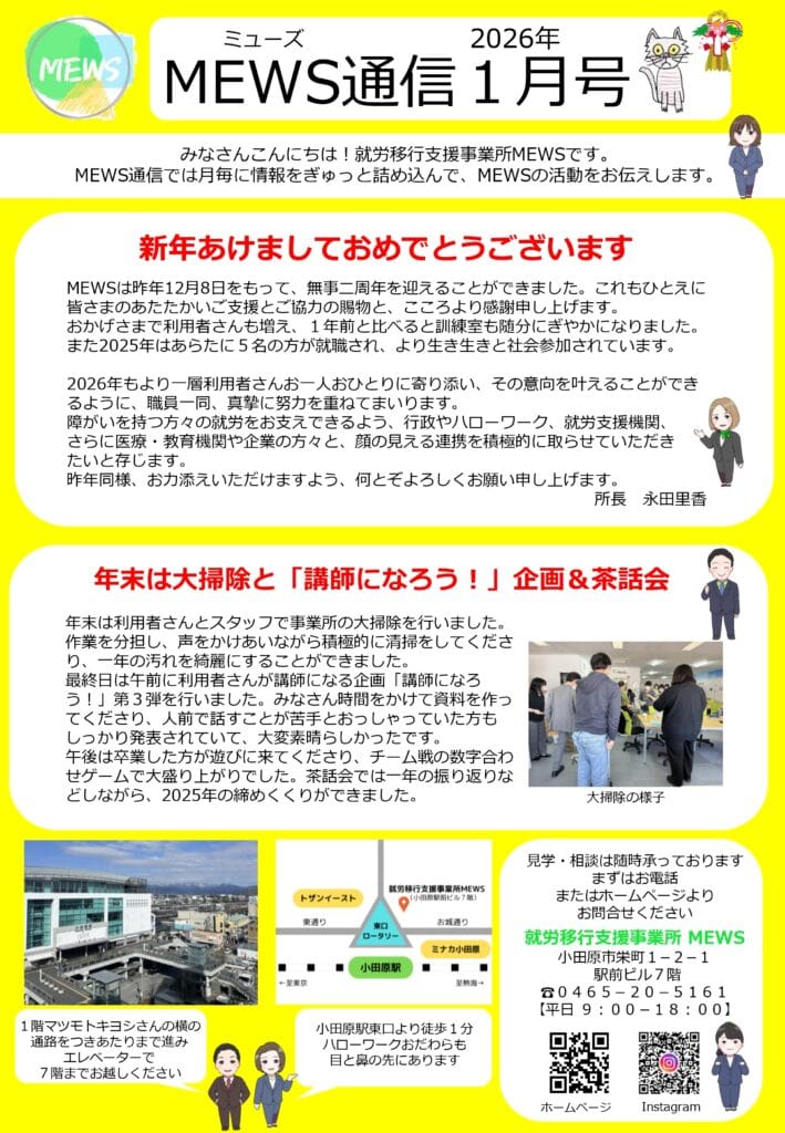 おかげさまで利用者さんも増え、1年前と比べると訓練室も随分にぎやかになりました。また2025年はあらたに5名の方が就職され、より生き生きと社会参加されています。